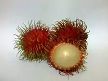 The rambutan (/ræmˈbuːtən/; taxonomic name: Nephelium lappaceum) is a medium-sized tropical tree in the family Sapindaceae. The name also refers to the edible fruit produced by this tree. The rambutan is native to Southeast Asia.[1] It is closely related to several other edible tropical fruits including the lychee, longan, pulasan and mamoncillo.[3][4]