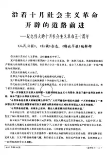 During the 1960s Red Flag temporarily ended publication, but was restarted in 1968.[9] The frequency of the journal was monthly between its start in 1958 and 1979.[6] It was published bi-monthly from 1980 to 1988.[6] It covered theoretical arguments supported by the party.[2] In May 1988 Chinese officials announced that the journal would be closed.[10] Finally, it ceased publication in June 1988, and was succeeded by Qiushi, another magazine.[1][5]