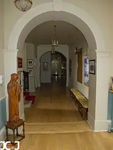 A local legend about the avenue tells of a ghostly coach and horses on the road between Red Rice and Abbotts Ann.[57] This is almost certainly a reference to a Roman mosaic unearthed in the nearby field by "Squire" Errington, depicting a "coach and a pair of galloping horses".[58] In the house itself, one boy who used to practise on the chapel organ was sure he had seen a 'Grey Lady' walking up the aisle. Two of the school staff, accommodated in the upper floor of the stable courtyard, (previously occupied by grooms and domestic servants of the estate), told of overwhelming feelings of terror at night experienced in one particular corner. Three stories could account for this. One tells of a drunken fight between two grooms, which ended with one of them killed by a fall down a steep staircase. The second relates to a shooting episode in 1886. The third is told by Lord Grantley in his autobiography 'A Silver-plated Spoon';[59] One evening the butler, appropriately named Butler, came in and announced that he intended to 'do himself in,' but that he had made arrangements for his duties to be taken over by the senior footman. The family's reaction was 'Poor old Butler, drunk again,' but they found him dead next day.[1][60]