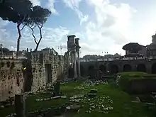 Moving north from the Arch of Septimius Severus, the region contained the collective Imperial Fora, a series of monumental public squares. They were four in number, the Forums of Caesar, Augustus, Nerva and Trajan. The Forum of Caesar contained the Temple of Venus Genetrix, with an equestrian statue of Julius Caesar standing in front of the temple.[5] The Forum of Augustus contained the Temple of Mars Ultor, while the Forum of Nerva contained the Temple of Minerva. The Forum of Trajan, which apart from the still standing Column of Trajan which dominated the open space, also contained an equestrian statue of Trajan, while the buildings contained an enormous library. Around the open space stood the statues of the great philosophers, poets and rhetoricians, which continued to be added to. In the fifth century, statues of Claudian and Sidonius Apollinaris were included in the Forum of Trajan.[6]