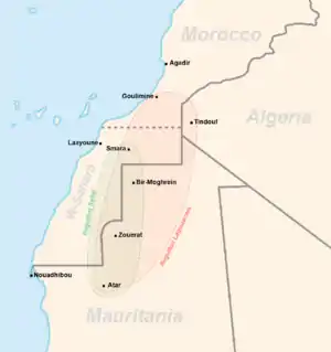 The grazing lands of the Reguibat fractions extended from Western Sahara into the northern half of Mauritania, the edges of southern Morocco and northern Mali, and large swaths of western Algeria (where they captured the town of Tindouf from the Tajakant tribe in 1895, and turned into an important Reguibat encampment).[5] The Reguibat were known for their skill as warriors, as well as for an uncompromising tribal independence, and dominated large areas of the Sahara desert through both trade and use of arms.[5]