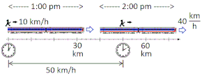 We begin with relative motion in the classical, (or non-relativistic, or the Newtonian approximation) that all speeds are much less than the speed of light. This limit is associated with the Galilean transformation. The figure shows a man on top of a train, at the back edge. At 1:00 pm he begins to walk forward at a walking speed of 10 km/h (kilometers per hour). The train is moving at 40 km/h. The figure depicts the man and train at two different times: first, when the journey began, and also one hour later at 2:00 pm. The figure suggests that the man is 50 km from the starting point after having traveled (by walking and by train) for one hour. This, by definition, is 50 km/h, which suggests that the prescription for calculating relative velocity in this fashion is to add the two velocities.