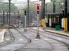 On May 31, 1958, the line was closed for rebuilding; it reopened on July 4, 1959 as a branch of the M.T.A. streetcar system.[1][8] The 1888 station building was removed to make space for the new station and connecting yard tracks.[9] When the line was converted for light rail use, it was assumed that most traffic would come from the inner part of the line, and thus an overhead loop was built connecting the line to Chestnut Hill Avenue. However, the outer half of the line proved more popular than expected, and Reservoir short turns were later reduced, with some extra short turn service remaining at times during rush hour.[8]