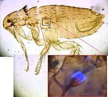 One unique property of rec1-Resilin is its ability to be identified due to autofluorescence. Fluorescence for resilin stems primarily from dityrosine, which are the result of crosslinks of tyrosine residues. When ultraviolet light irradiates a sample of rec1-Resilin at 315 nm to 409 nm emissions, the rec1-Resilin begins to show blue fluorescence.[12] An example of the blue fluorescence exhibited by the dityrosine residues in resilin is shown in the figure below of a flea.