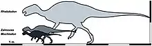 Traditionally, it has been thought Mochlodon and Zalmoxes were insular dwarfs. The smaller sizes of Mocholodon (1.6 to 1.8 m) and Zalmoxes (2.0 to 2.5 m) relative to Rhabodon (5.0 to 6.0 m)[6] and the island locale that all three genera shared led to the hypothesis of island nanism in the case of the former two. However, Ősi et al. (2012) proposed that Rhabdodon underwent gigantism on the mainland, as opposed to Zalmoxes and Mochlodon experiencing nanism on island habitats.[3] Ösi and colleagues used femur length to estimate body size through evolution in the rhabdodontid lineage. The conclusion was that in the eastern lineage comprising Zalmoxes and Mochlodon, the size ranges of both were too close to that of the ancestral rhabdodontid to support the hypothesis of nanism. Ösi and colleagues instead came to the conclusion that Rhabdodon in the western lineage is a case of gigantism in the group Rhabdodontidae.[3]