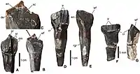 Rhabdodontids have a simple dentition with leaf-shaped teeth used for a powerful scissors-like shearing. These teeth are well-suited to a diet of tough and fibrous plants, examples of which include monocts and grass.[4] Each tooth has a ridge on it that is offset from the midline of the tooth. These ridges also have a specific pattern which is unique to Rhabodontids: their dentary teeth have a central primary ridge with multiple equally spaced secondary ridges, and their maxillary teeth have no primary ridge and have similarly-sized secondary ridges.[1][3][4]