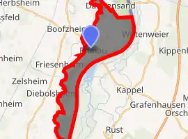 Prior to 1398, the village of Rhinau was situated at the bank of Rhine. Today's village dates from the 16th Century. At that time, the city was being gradually submerged into the waters of the Rhin.[2] To avoid this fate, the village was rebuilt further inland, where it sits today. Though further from the river that gave it its name, the name continued.