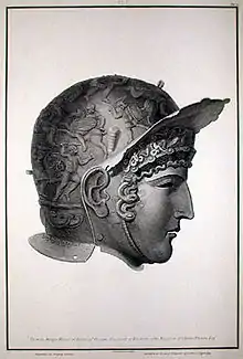The Ribchester Helmet is a Roman bronze ceremonial helmet dating to between the late 1st and early 2nd centuries AD, which is now on display at the British Museum.[1] It was found in Ribchester, Lancashire, England in 1796, as part of the Ribchester Hoard. The model of a sphinx that was believed to attach to the helmet was lost.[2]