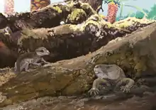 All specimens of Riograndia come from the Late Triassic aged Caturrita Formation.[1] The formation dates to about 225 million years ago, and it based in the present-day country of Brasil.[3] Dinosaurs from the formation only include the sauropodomorph Unaysaurus and the theropod Guaibasaurus. Non-dinosaurian animals include the dinosauriform Sacisaurus; the dicynodontid Jachaleria; an unnamed phytosaurian; isolated archosaurian teeth; an amphibian classified in Stereospondyli; and many common tetrapods smaller than 15 cm (5.9 in) long. Among the tetrapods is the procolophonid Soturnia; the sphenodontid Clevosaurus; the lepidosaurian Cargninia; the pterosaurian Faxinalipterus, and an assortment of mammaliamorphs including Riograndia, Brasilodon, Brasilitherium, Irajatherium, and Minicynodon.[1]