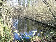 Several springs feed into the headwaters of the River Bourne and there are three contenders for its actual main source. It could be a spring on the North Downs at New House Farm, Yaldham, though the Environment Agency prefers a spring to the west of Oldbury Hill. It could be a spring on Oldbury Hill which feeds the Waterflash, a tree-ringed pond, which drains to the north of the hill. Oldbury Hill is on the Greensand Ridge. These merge in Ightham where the Bourne has cut a 117 feet (36 m) deep gorge through the limestone. In 1891 ice age relicts were found near here in a quarry. The river passes through woods to Basted, where a mill pond gives clues to its industrial past. From Ightham through Hadlow to Golden Green, the river powered numerous watermills. Road names are full of mill references. The principal products were flour and paper. The area of the Medway Valley near East Peckham is prone to flooding and the River Bourne contributes much water, so is regularly monitored and dredged to ensure an uninterrupted water flow. There is a gauging station at Hadlow (TQ 632 497 51°13′23″N 0°20′17″E).[2][3][4][5]