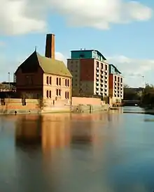 On the eastern bank of the Soar in central Leicester are the premises of Donisthorpe and Company, a producer of textiles. The Donisthorpe Mill, also known as Friars' Mill, is one of the oldest mills in the East Midlands, and manufacturing activity has occurred on its site since the 1730s. The Mill was awarded listed status in 1975.[15] A number of surrounding buildings, including a Victorian pump house, were also listed at this time.[16][17] The Donisthorpe Company left the factory in 1983, which led to immediate concerns about the mill's conservation.[18] The building stood empty for a number of years, and fell into a state of disrepair. In July 2012, a fire destroyed its roof, clocktower and most of the interior.[19][20] In November 2012, Leicester City Council announced its decision to purchase and restore the Donisthorpe Mill building.[21]