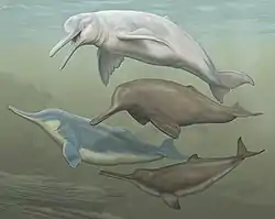 River dolphins are thought to have relictual distributions, that is, their ancestors originally occupied marine habitats, but were then displaced from these habitats by modern dolphin lineages.[10][11] Many of the morphological similarities and adaptations to freshwater habitats arose due to convergent evolution; thus, a grouping of all river dolphins is polyphyletic. Amazon river dolphins are actually more closely related to oceanic dolphins than to South Asian river dolphins.[12] Isthminia panamensis is an extinct genus and species of river dolphin, living 5.8 to 6.1 million years ago. Its fossils were discovered near Piña, Panama.[13][14]