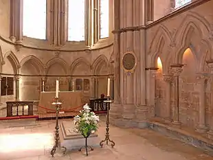 Upon his death, he was almost universally revered as a saint in England, with miracles reported at his shrine and pilgrims to it granted an indulgence by the bishop of Lincoln.[27] Attempts by the Lincoln bishops, the University of Oxford, and Edward I to secure a formal canonisation, however, failed.[27] In most of the modern Anglican Communion, Grosseteste is considered beatified and commemorated on 9 October.[28] However, the Episcopal Church (USA) commemorates him with St. Hugh of Lincoln on 17 November.[29]