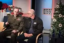 In 2014, Irvine founded The Robert Irvine Foundation[50] to honour the men and women of the military. The foundation raises money and then allocates grants to active duty men and women and veterans in need.[51] Irvine is also a regular contributor to the Gary Sinise Foundation and regularly appears at the organization's Invincible Spirit Festivals. For his work in honouring the men and women of the US military, Irvine was honoured with a Patriot Award from the Medal of Honor Society in September 2015,[52] alongside ABC News' Bob Woodruff, Patriots owner Robert Kraft, and US Marine Corps Commandant Joseph F. Dunford, Jr. In 2016, Irvine was awarded the third highest honour within the US Department of the Army Civilian Awards, the Outstanding Civilian Service Award, for substantial contributions to the US Army community through his work with the Robert Irvine Foundation.