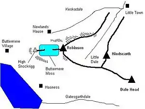 The western flanks of the fell fall to Buttermere, the village itself standing on Robinson's territory. The top and bottom sections are quite steep but the slope levels out at 1,500 ft to accommodate Buttermere Moss, in Wainwright's words “ a wide marshy depression from which water cannot escape except by being carried away in the boots of pedestrians.”[1] At the head of the lower slope is the subsidiary top of High Snockrigg (1,725 ft), a fine viewpoint for the Buttermere valley. On the south western rim of the Moss is Goat Crag, overlooking Buttermere lake.