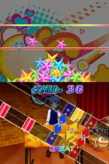 Players can also customize the character's outfits and instruments by purchasing them in the game's shop menus using points. Points are obtained clearing songs and collecting stars. Stars are piled up on the top screen as the player plays through a song. The better the score, the higher the stars will pile. If the stars reach past the top line, players will collect the stars by dragging the stylus at the end of each stage.