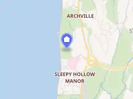 The property is located in the town of Mount Pleasant, in Westchester County, New York. It lies west of U.S. Route 9, then known as Broadway, and 3 miles north of Tarrytown and 1.5 miles south of Scarborough. It was less than one mile from Sleepy Hollow Country Club. The property borders railroad tracks, formerly of the New York Central Railroad and today as Metro-North's Hudson Line. The property also borders the Hudson River for 3⁄4 mile (1.2 km). The lawns and gardens spanned 26 acres (11 ha) of the property. Corrugated iron fences on concrete fenced off part of the property.[13] During William Rockefeller's ownership, the property was within the tax district of Tarrytown;[34] the current park property extends nearly the entire riverfront from Sleepy Hollow to Briarcliff Manor, and from the Hudson River to Route 9.