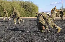 A dive roll is an acrobatic stunt that begins with a horizontal forward diving motion and results in a forward roll. It is considered an advanced forward roll, demonstrating flight and a smooth landing.[12] It is also used in other sports such as wrestling and parkour to reinforce the motion of landing correctly.[13]