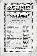 Rolland's dramas have been staged by some of the most influential theatre directors of the twentieth century, including Max Reinhardt and Erwin Piscator.[15] Piscator directed the world première of Rolland's pacifist drama The Time Will Come (Le Temps viendra, written in 1903) at Berlin's Central-Theater, which opened on 17 November 1922 with music by K Pringsheim and scenic design by O Schmalhausen and M Meier.[16] The play addresses the connections between imperialism and capitalism, the treatment of enemy civilians, and the use of concentration camps, all of which are dramatised via an episode in the Boer War.[17] Piscator described his treatment of the play as "thoroughly naturalistic", whereby he sought "to achieve the greatest possible realism in acting and decor".[18] Despite the play's overly-rhetorical style, the production was reviewed positively.[17]