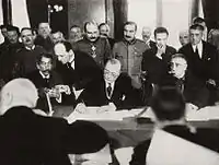 The Romanian government signed a treaty with the Allies (France, Britain, Italy, and Russia) on 17 August 1916 that pledged to declare war on Austria-Hungary by 28 August. The Romanian ambassador in Vienna actually transmitted the declaration of war on 27 August. Germany, caught by surprise, responded with a declaration of war on Romania the next day (28 August). The dates of the Bulgarian and Ottoman declarations of war are disputed. Ian Beckett says that Bulgaria did not issue a declaration of war prior to its attack of 31 August.[25] Other sources place the declaration on 30 August[26] or 1 September.[27][28] The Ottoman declaration took place either on 29 August,[26] 30 August[27] or 1 September.[28] Within two days of her own declaration, according to one source, Romania found herself at war with all the Central Powers.[29]