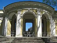 The pavilion sits in the northern end of the Mikhailovsky Garden, on the southern bank of the Moyka River. Designed in the Neoclassical style, it has an open Doric colonnade connecting two square rooms, cast-iron fences, and a pier on the river accessed by two flights of granite steps.[1][2] The pavilion is in the east of the garden, off the centre line of the Mikhailovsky Palace to the south, but aligned with the centre line of the Field of Mars to the north. Explanations for this are either that Rossi had planned a second pavilion to be built to the west, creating a symmetrical view to and from the Mikhailovsky Palace, but the second pavilion was never built; or that it was a deliberate choice by Rossi to connect the Mikhailovsky ensemble with the Field of Mars ensemble on the other side of the river.[2][3][4]