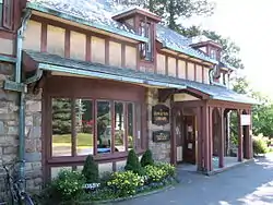 The former Rock Ledge estate at 33 and 40-42 Highland Avenue was added to the National Register of Historic Places in 1977. In 1910, James A. Farrell, later president of the United States Steel Corporation, built a Tudor revival mansion, which burned down in 1913 and was rebuilt in granite. The estate was later bought by the Remington Rand Corporation, developers of the UNIVAC computer, which merged with Sperry Corporation to form Sperry Rand.[5] Since 1966, the Farrell family stables have been converted to the Rowayton Community Center and the Rowayton Library.[6] In 1964, part of the estate was purchased by the Thomas School for girls, a day and boarding school founded by Mabel Thomas in 1922.[7][8] The school later merged with other private schools in the area, eventually becoming King Low Heywood Thomas in 1988. The school is now co-educational and located in Stamford, Connecticut. The mansion and attached office building were previously owned by Hewitt Associates. Currently, the main house of the estate is home to Graham Capital Management, L.P.