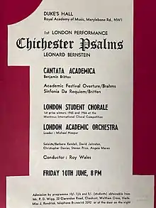 On 6 June 1966, Wales conducted the first London performance of Leonard Bernstein's Chichester Psalms with the London Academic Orchestra, London Student Chorale and Pro Arte Singers in the Duke's Hall of the Royal Academy of Music. Bernstein's work also featured in the official opening concert of the University of Warwick Arts Centre in 1974, in the presence of the Composer, who was the recipient of an Honorary Doctorate from the University.