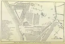 From the beginning, gun carriages had been stored at the Warren (unlike the guns themselves the wooden carriages had to be kept under cover). The first store ('Old Carriage Yard') had been built as early as 1682, and probably also contained workshops for the repair or scrapping of old carriages.[5] In 1697 a far larger complex of sheds ('New Carriage Yard') was built on what had been Prince Rupert's gun battery.[9]