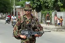 The first New Zealand infantry contribution to Vietnam was a 182-man rifle company which arrived from Terendak Military Camp in Malaya on 13 May 1967. Soldiers from C and D Companies 1 RNZIR with six months left in their two-year tour were selected. Most had seen operational service with British forces as part of the 28th Commonwealth Infantry Brigade Group, 17th Gurkha Division in Malaya and Borneo.[28] The company was named "V" for "Vietnam", with the phonetic "Victor."[29] For the first two weeks, Victor Company (V Coy) served with the outgoing 6 RAR. The New Zealanders adopted the Australian Rifle company formation, consisting of a Headquarters (commanded by a Major) and three platoons, each with three sections (squads.) Each squad was made up of a Corporal, a Scout group made up of two Privates, a Rifle group including a M79 grenadier made up of four Privates, and a Machine Gun group consisting of a Lance Corporal, and two Privates armed with M60 machine guns. Riflemen, including the M79 grenadier, used the Australian 7.62mm SLR semi-automatic self-loading rifle, while officers, signallers, NCOs, and one of each scout group carried the U.S 5.56mm M16 rifle. Eventually the New Zealand infantry would adopt U.S-issue M72 rocket launchers, M26 grenades, and Claymore mines; and other U.S-issue webbing and equipment.