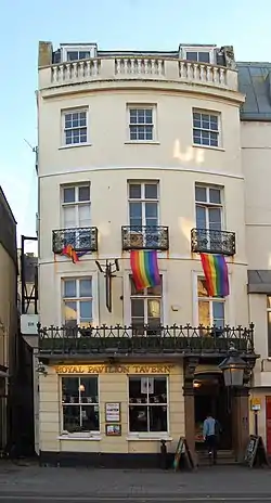 The building later changed from a hotel to a conventional inn called the Royal Pavilion Tavern. An early proprietor offended Maria Fitzherbert, the Prince Regent's mistress who lived at Steine House (which backed on to the inn), by putting up a sign on the rear wall which read "Gin Palace". After she complained, he altered it to "Shades"—a local term with a similar meaning.[8] That name was recalled in 1991 when the building was substantially refurbished; part of it was converted into a café-bar and restaurant called Shades. A World War II-era bar counter was retrieved from a pub at London Victoria railway station and installed during this refit.[16] The pub was latterly owned and operated by the Mitchells & Butlers chain.[17] On 24 September 2019 the company announced that the pub would close permanently two days later.[2] The building is to be converted for residential use.[18]