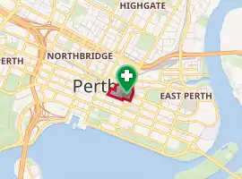 The hospital traces its history back to the first colonial hospital, which was established in a tent on Garden Island, just off the coast of Western Australia, in 1829.[1] In June 1830, the hospital tent was re-erected in Cathedral Avenue, Perth. From 1833 a more substantial colonial hospital operated for a short time from a rented room in a private house. Six years later, in December 1840, this was re-opened in a building formerly used as stables on the corner of St Georges Terrace and Irwin Street. The hospital commenced operations on the corner of Murray Street and Victoria Square[1] on 14 July 1855, and was formally named the Colonial Hospital. In the years since, it has expanded north to Wellington Street. It has been known variously as the Perth Public Hospital, the Perth Hospital and finally, from 1946, as Royal Perth Hospital.