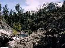 The Rubicon River is a major tributary of the Middle Fork American River in the Sierra Nevada of Northern California, west of Lake Tahoe. Its length is 60 miles (97 km) with a watershed of about 184 square miles (477 km2). The river's headwaters are in the Crystal Range of the Sierra Nevada, within the Eldorado National Forest's Desolation Wilderness. Historically, the Rubicon River was known as the South Fork of the Middle Fork of the American River.