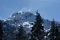 Ruby Mountain is located in the marine west coast climate zone of western North America.[3] Most weather fronts originate in the Pacific Ocean, and travel northeast toward the Cascade Mountains. As fronts approach the North Cascades, they are forced upward by the peaks of the Cascade Range, causing them to drop their moisture in the form of rain or snowfall onto the Cascades (Orographic lift). As a result, the west side of the North Cascades experiences high precipitation, especially during the winter months in the form of snowfall.[3] Due to its temperate climate and proximity to the Pacific Ocean, areas west of the Cascade Crest very rarely experience temperatures below 0 °F (−18 °C) or above 80 °F (27 °C).[3] During winter months, weather is usually cloudy, but, due to high pressure systems over the Pacific Ocean that intensify during summer months, there is often little or no cloud cover during the summer.[3] Because of maritime influence, snow tends to be wet and heavy, resulting in high avalanche danger.[3]