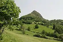 Ostrovica or Ostrvica hill (Serbian Cyrillic: Островица/Острвица, 44°10′08″N 20°27′37″E), is the northwestern extension of Rudnik's massif. The 758 m (2,487 ft) tall extinct volcano sharply rises above the surrounding terrain, though the top is easily accessible, and has a specific morphological physiognomy compared to its surroundings. Being of volcanic origin, it is part of the wider eruptive region of Šumadija. With the surrounding Zagrađe-Trudelj area, Ostrovica makes one volcanic massif. It is made of magmatic rocks, chiefly quartz latite and dacite (andesite), suitable for masonry and road building. The peak is today a barren rocky ground, partially covered with shrubs, thorny bushes and rare grassy patches.[10][11]