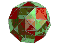 ![]() Perspective projection of the runcinated 24-cell into 3 dimensions, centered on an octahedral cell. The rotation is only of the 3D image, in order to show its structure, not a rotation in 4-space. Fifteen of the octahedral cells facing the 4D viewpoint are shown here in red. The gaps between them are filled up by a framework of triangular prisms. |