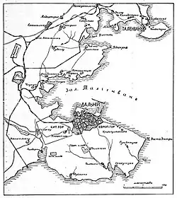 In 1899 V.V. Sakharov (Владимир Васильевич Сахаров, 1860 - 1904, died of typhoid fever in besieged Port Arthur), a Russian engineer who had been tasked earlier with the design of Vladivostok, was selected to implement plans for the development of Russian Dalniy. He approached the monumental task of transforming what was a scattering of sleepy Chinese fishing villages into a port city to rival Shanghai or Tianjin by dividing construction into two phases. Overall Sakharov's plans were inspired by the "Garden City" or "City Beautiful" movements that were influencing and transforming the urban centers of Europe and America. It called for the city to be divided into five connected districts - one commercial, two administrative, one residential, and one Chinese, and all supplied with electricity and a modern water system.[7]