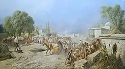 Campaign of 1866: The Bokhara was now involved in the war. In February 1866 Chernayev crossed the Hungry Steppe to the Bokharan fort of Jizzakh. Finding the task impossible, he withdrew to Tashkent followed by Bokharans who were soon joined by Kokandis. At this point Chernayev was recalled for insubordination and replaced by Romanovsky. Romanovsky prepared to attack Bohkara, the Amir moved first, the two forces met on the plain of Irjar.[6] Note: Near Kattakurgan, Uzbekistan about halfway between Jizzakh and Bokhara. The Bukharians scattered, losing most of their artillery, supplies and treasures and more than 1,000 killed, while the Russians lost 12 wounded. Instead of following him, Romanovsky turned east and took Khujand, thus closing the mouth of the Fergana Valley. The losses of the Kokand residents were more than 2.5 thousand killed, 130 Russians killed and wounded. Then he moved west and took Ura-Tepe [lower-alpha 2] and Jizzakh from Bukhara. During the capture of Jizzak, the Bukharians lost 6,000 killed and 3,000 prisoners, as well as all the artillery. In total, during the campaign of 1866, the Russian troops lost 500 people killed and wounded, while the natives lost more than 12,000 killed.[7] Defeats forced Bukhara to start peace talks.