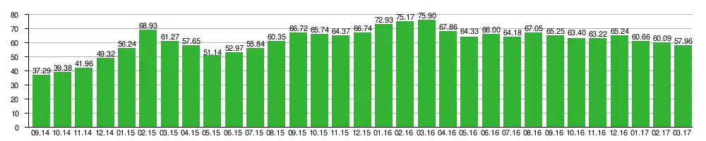 In August 2015, oil prices fell to US$37 per barrel and then bounced to more than US$45 on 28 August.[26] Now as OPEC has reduced production from November 2016 oil prices have started to move up and so does the ruble.