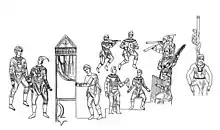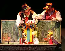 Between the eleventh and thirteenth centuries, the word used for theater in Russia was pozorishche, which was a distinct term from igrishche, a dramatic performance including live actors.[4] Kukla, the modern Russian term for puppet theater, was first used in 1699.[5] Itinerant minsrels known as skomorokhs were the original puppeteers in Russia and by the thirteenth century had relocated from Kievan Rus' to Novgorod. By the mid-sixteenth century, they shifted their activity to Moscow when Ivan IV ordered them to be taken there with their performing bears.[6] By the 1630s, puppets had become an integral part of the performances of the minstrels, including an innovative means of creating a stage with blankets tied at the waist and lifted over their heads with poles so that their hands were free to move their puppets.[7] In 1648, the skomorokhi were barred from further performances by a law that sought to wipe out superstition in the interests of Russian morality. From then on, puppets and traditions were increasingly imported from Germany and Denmark.[8] By the mid-eighteenth century, regular performances by French, German, and Italian puppetry companies were also common in Russia.[9]