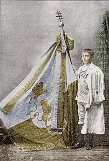 ![]() A boy with the pilgrimage blue-yellow flag during the Ruthenian/Ukrainian pilgrimage to the Holy Land in 1906. | |