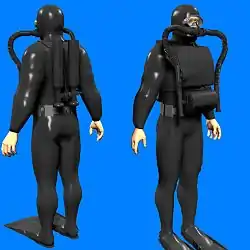 The breathing bag is square with rounded corners, on his chest, exposed. Its absorbent canister is cylindrical with flat ends, crosswise on his belly, in a rubber sheath. It has a loop of wide corrugated breathing tubes; one of them originates at each end of the canister; the right tube has a side connection to let gas in and out of the breathing bag as he breathes. It has two long thin oxygen cylinders lengthwise on his back. It can be supplied with a mouthpiece with a neck strap; the mouthpiece has a valve on its front to close the breathing tubes when the mouthpiece is not in his mouth. Its dive duration is about 3 hours.