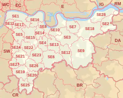 The SE (South Eastern) postcode area covers a broad radial swathe of the south-east of the London post town from the Albert Embankment to West Heath and the nearest edges of Sidcup and Selhurst. It loosely corresponds to the Boroughs named after Southwark, Lewisham and Greenwich plus indicated parts of those named after Croydon (north), Lambeth (east), Bexley (west) and Bromley (its northwest corner).