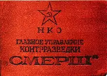 SMERSH (Russian: СМЕРШ) was an umbrella organization for three independent counter-intelligence agencies in the Red Army formed in late 1942 or even earlier, but officially announced only on 14 April 1943. The name SMERSH was coined by Joseph Stalin. The main reason for its creation was to subvert the attempts by German forces to infiltrate the Red Army on the Eastern Front.[3][4]