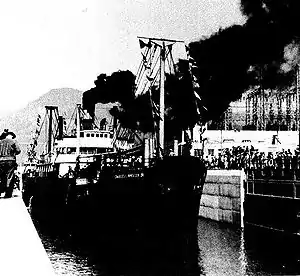 In 1938, the world′s largest single-lift lock was opened at the Bonneville Dam on the Columbia River.[4] As part of the opening ceremonies of the lock, Captain Arthur Riggs, a veteran upper Columbia river pilot, took Charles L. Wheeler Jr. – which was operated by McCormick Steamship Company and loaded with sugar, building materials, beer, hardware, automobiles, and general freight – upstream from Portland, transited the Bonneville Locks and continued on to the historic upper river steamboat port of The Dalles, Oregon.[5] She was the first ship to transit the lock at Bonneville Dam[6] and the first ocean-going merchant ship to transit the Columbia River all the way to The Dalles, located 200 miles (322 km) upstream from the Pacific Ocean.[7] Once unloaded at the Port of the Dalles, the ship was then loaded with lumber, wheat, flour, and other local products for the return voyage. Residents of The Dalles had hoped the trip would bring increased business to their port, but the trip was a one-time event,[5] and the Columbia River is dominated by barge traffic.[4]