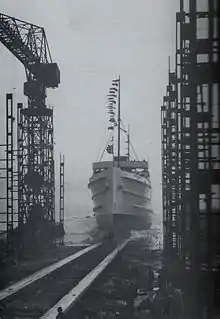 Mona's Queen was launched by Mrs J. Waddington at 9:30am on 12 April 1934 in the presence of G. Clucas (Chairman of the Isle of Man Stem Packet Company), W. Cowley (director), J. Waddington (director), A. Robertson (director) and numerous other representatives of the Company. Amongst those representing the builders were: W. Hichens (Chairman), R. Johnson (managing director) and J. Caird (assistant managing director). Also in attendance were the Lord Mayor and Lady Mayoress of Liverpool and the Mayors of Wallasey, Birkenhead and Bootle. This rather unusual time for the ship's launch was as a consequence of tide conditions in the River Mersey.[5]