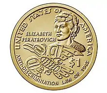 The 2020 dollar design commemorated the 75th anniversary of Alaska's Anti-Discrimination Act of 1945 and featured the image of Alaskan civil rights advocate and member of the Tlingit Nation Elizabeth Peratrovich.[24]