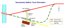 The first stage, called the Sacramento Valley Station Intermodal Phase I, was completed on August 13, 2012, with the complete relocation of all heavy-rail passenger platforms (Amtrak) approximately 1,000 feet (300 m) further north from their previous location. Sacramento Regional Transit Gold Line light rail operations remain in their original location directly behind the station depot.