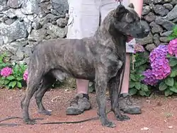 The breed is large but not over-sized; up to a maximum of 60 cm (23.6 ins) at the withers and 35 kg (77 lbs) in weight, with females slightly smaller. The general appearance is of a normally proportioned, deep chested, muscular dog with a broad head and medium length neck, straight back, and long legs. The tail is held up and is slightly curved. The breed has drop ears, unless they are cropped. The coat is a brindle of brown (pale brown is described as fawn) or grey, with black; it is short, smooth and harsh to the touch, with a short fringe on the tail (if undocked) and on the backs of the rear legs.