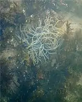 At low tide, sandy areas are exposed between the rocks and these support a fauna characteristic of sediment shores including Common starfish Asterias rubens and burrowing animals such as the Razor shell Ensis arcuata, the Thin tellin Tellina fabula and the Sea potato Echinocardium cordatum.[1]
