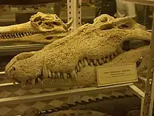 The largest skull of a saltwater crocodile that could be scientifically verified was of a specimen in the Muséum national d'Histoire naturelle collected in Cambodia. Its skull was 76 cm (30 in) long and 48 cm (19 in) wide near its base, with 98.3 cm (38 3⁄4 in) long mandibles. The length of this specimen is not known but based on skull-to-total-length ratios for very large saltwater crocodiles its length was presumably somewhere in the 7 m (23 ft) range.[9][41] If detached from the body, the head of a very large male crocodile can reportedly weigh over 200 kg (440 lb) alone, including the large muscles and tendons at the base of the skull that lend the crocodile its massive biting strength.[42] The largest tooth measured 9 cm (3 1⁄2 in) in length.[43][44] Other crocodilians have a proportionately longer skull, like the gharial (Gavialis gangeticus) and the false gharial (Tomistoma schlegelii), both their skulls and bodies are less massive than in the saltwater crocodile.[9]